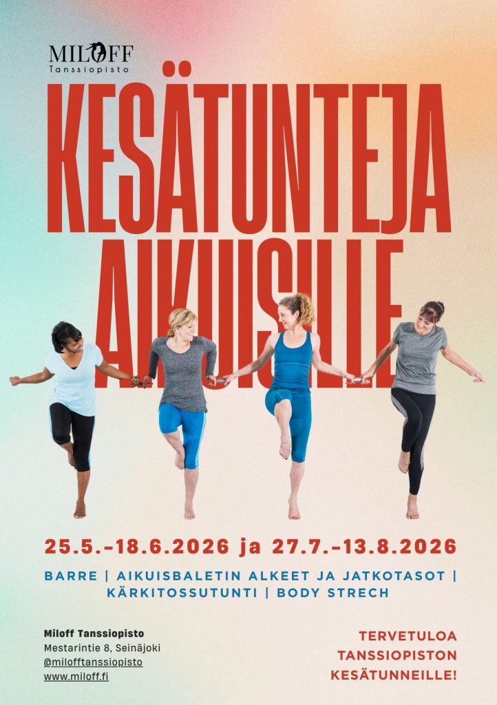 Aikuisten kesätunnit pidetään 25.5.-18.6.2026 ja 27.7.-13.8.2026. Tunnit ovat tarkoitettu aikuisille ja yli 13-vuotiaille nuorille. Tervetuloa mukaan Tanssiopiston kesätunneille tanssimaan ja liikkumaan. Tunneille voi myös tulla kokeilemaan ja tutustumaan ilman aikaisemaan kokemusta. Ensimmäinen tutustumiskerta on aina ilmainen.