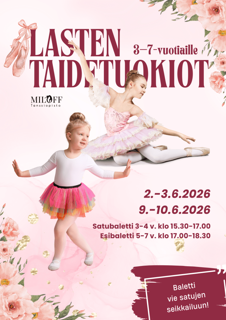 Lasten taidetuokiot vievät lapset baletin kiehtovaan maailmaan ja tarjoavat iloisia ja inspiroivia hetkiä tanssin ja luovuuden parissa. Elämykselliset ja monipuoliset taidetuokiot innostavat lasta liikkumaan, eläytymään musiikkiin ja käyttämään mielikuvitustaan.