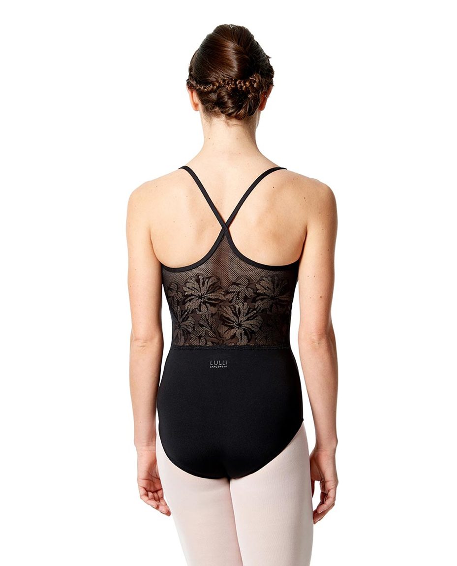Aikuisten tanssipuku Lullilta. Selässä läpikuultavaa harsokangasta kukkakuviolla.