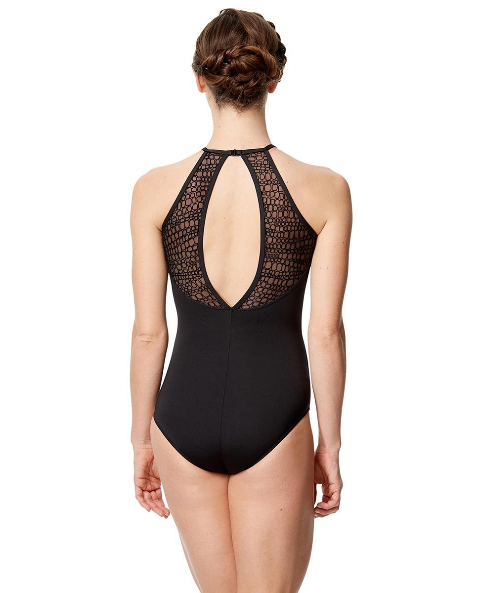 Aikuisten tanssipuku, jossa edessä pitsiyksityiskohta ja takana yläselässä aukko.