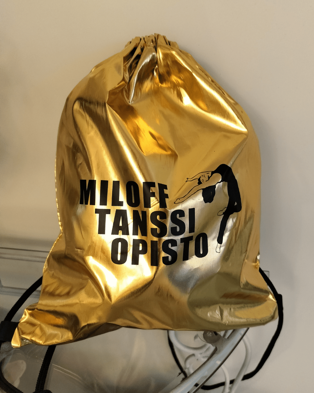 Jumppakassit Miloff Tanssiopiston logolla! Kiiltävä ja hieman liukas kangas sekä säädettävät nauhaolkaimet.