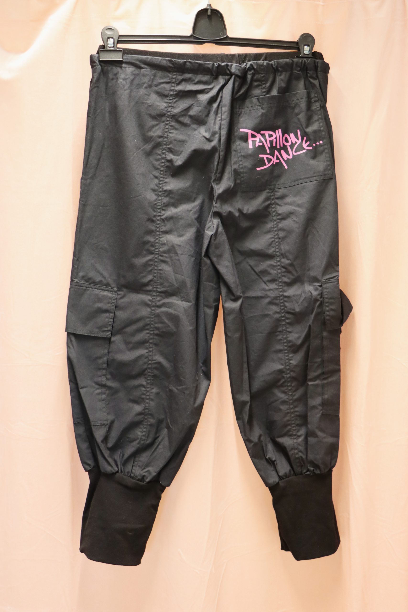 Aikuisten tanssihousut, joissa on takana Papillon Dance- logo. Housuissa on myös polvitaskut.